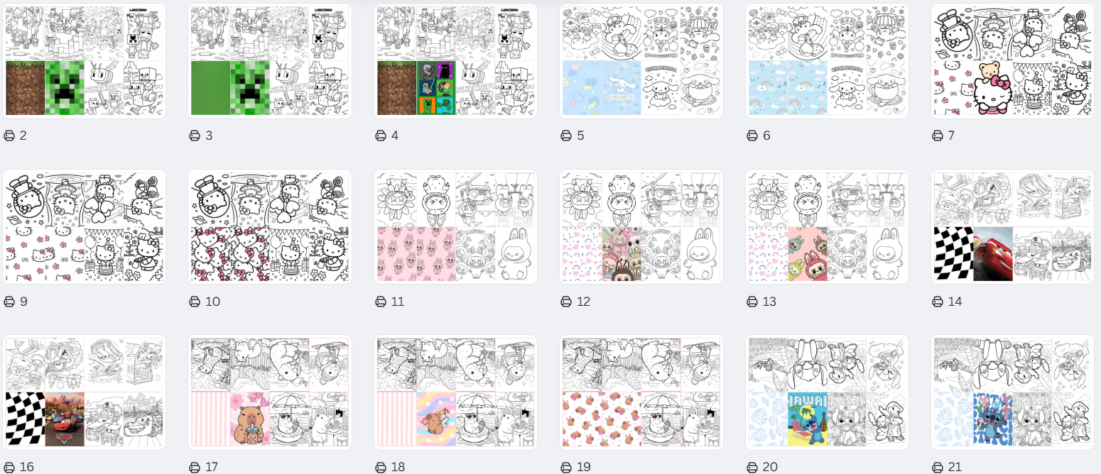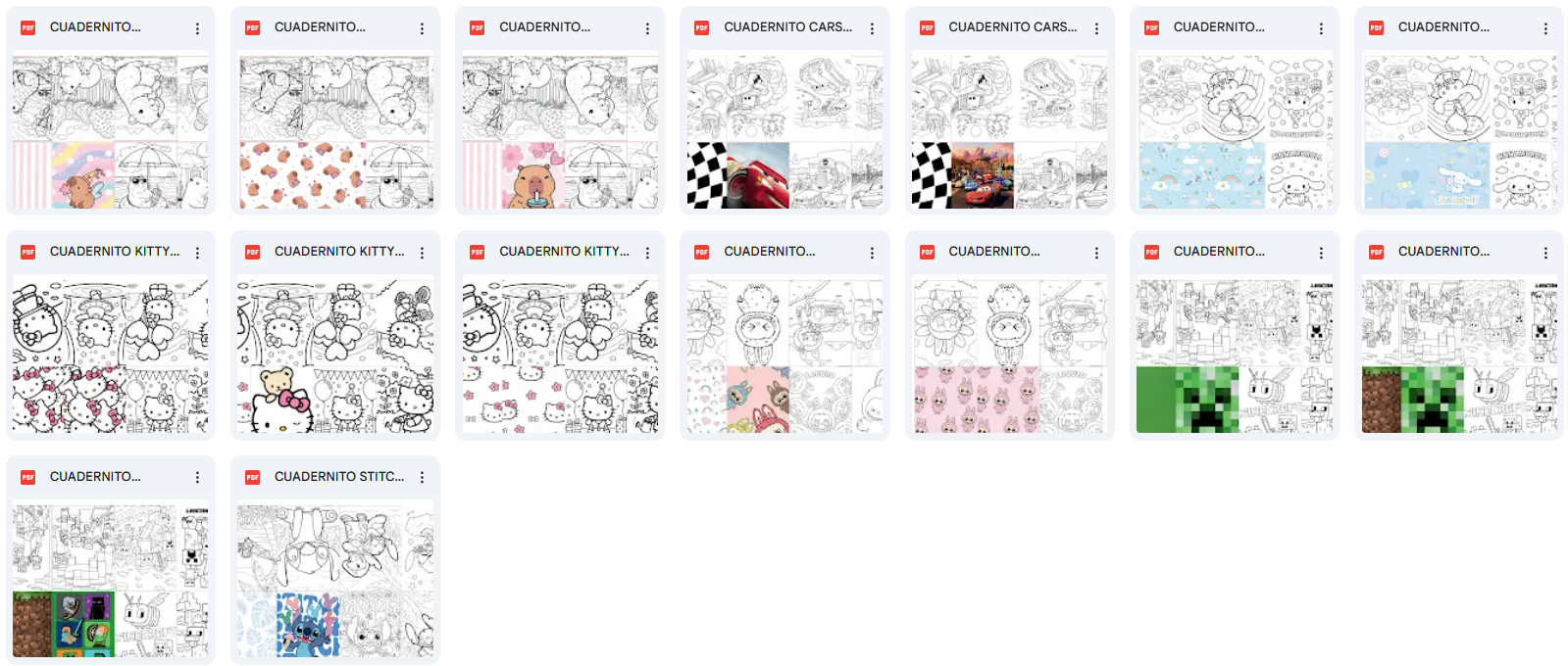 🎨 Contenido: dibujos para colorear (temática: Rayo McQueen- Cars, Hello Kitty, Labubu, Cinnamonroll, Minecraft, Capibara, Stitch)